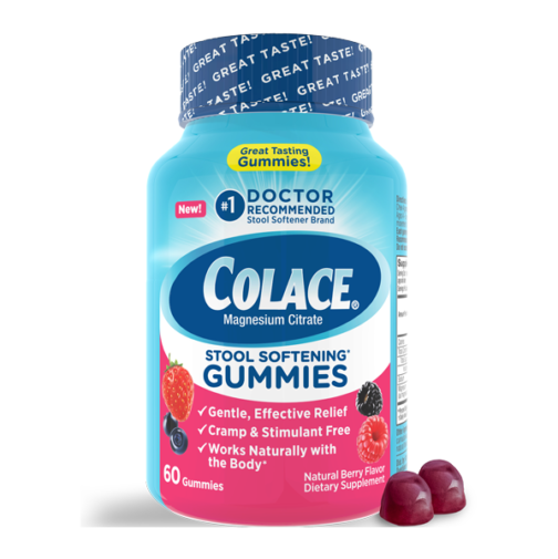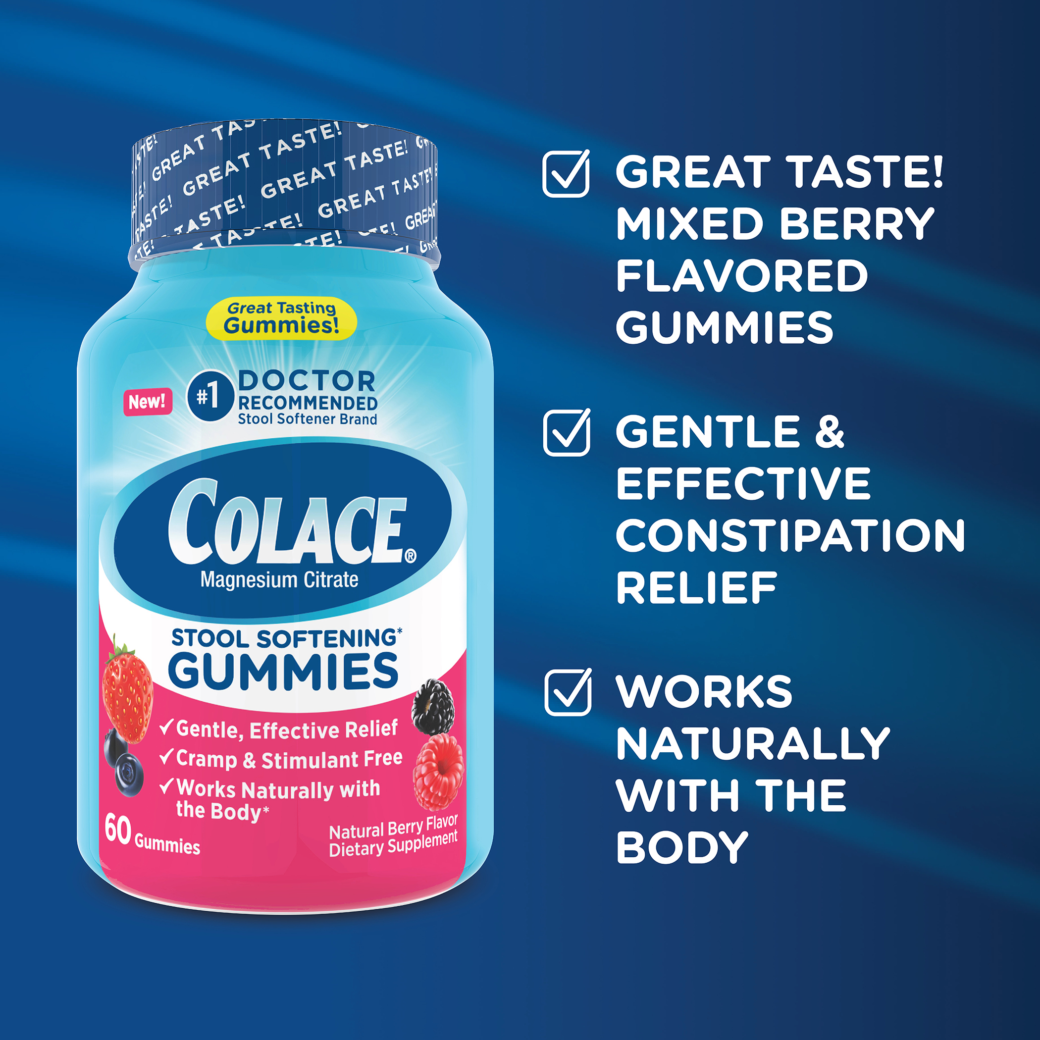 Colace Mixed Berry Flavored Stool Softening Gummies with Magnesium Citrate deliver gentle & effective constipation relief by increasing the water in your stool so it’s softer and therefore easier to go to the bathroom. They’re stimulant free with no cramping, straining, or harsh laxative effect. Plus, they have no artificial sweeteners, no high fructose corn syrup, no colors from artificial sources, and they’re gluten free. With Colace Mixed Berry Flavored Gummies, relieving occasional constipation has never been so delicious!