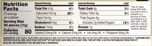Cane sugar‡, palm kernel and palm oils and cocoa butter‡, nonfat milk, milk fat (butter), sunflower lecithin and Tahitian vanilla. ‡Fair Trade Certified™ by Fair Trade USA® 50% Fair Trade Certified™ Ingredients. No hydrogenated oils.
