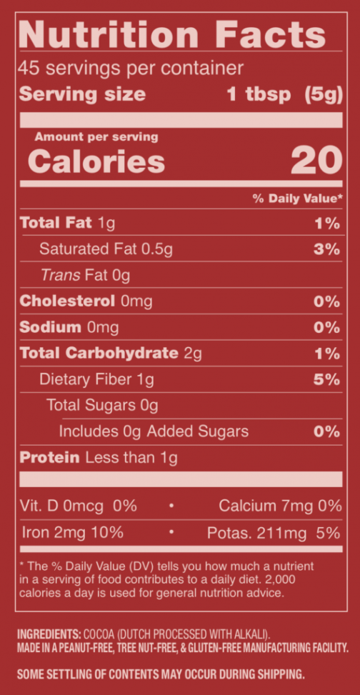 Cocoa (Dutch processed with alkali). Made in a segregated processing area that does not contain any of the 9 major allergens -
