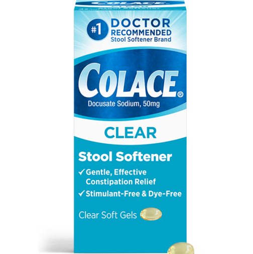 Colace® Clear soft gels work differently than harsh laxatives by increasing the water in your stool so it’s softer and therefore easier to go to the bathroom. Colace Clear is stimulant free with no cramping, straining, or harsh side effectives & its clear soft