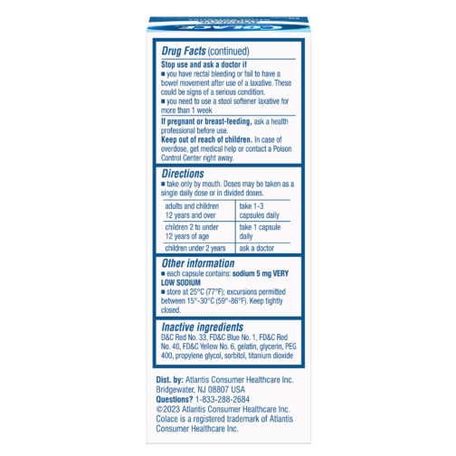 Colace® Regular Strength Capsules are a gentle and effective solution for relieving occasional constipation. Each capsule contains 100mg of docusate sodium, a stool softener that works by increasing the water content in the stool, making it softer and easier to pass. Colace® provides relief within 12 to 72 hours without causing cramps or harsh urgency. It’s safe for use by adults and children over 12, and can be part of a daily regimen for those needing regular support. Trusted for over 60 years, Colace® helps you stay comfortable and maintain digestive health.