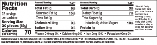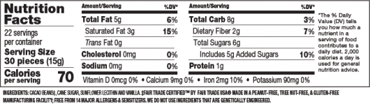 Cacao beans‡, cane sugar, sunflower lecithin, and vanilla. Free from 14 major allergens and sensitizers. ‡Fair Trade Certified by Fair Trade USA® 63% Fair Trade Certified™ Ingredients