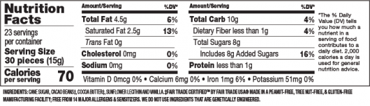Cane sugar, cacao beans‡, cocoa butter‡, sunflower lecithin and vanilla. Free from 14 major allergens and sensitizers. ‡Fair Trade Certified™ by Fair Trade USA® 46% Fair Trade Certified™ Ingredients